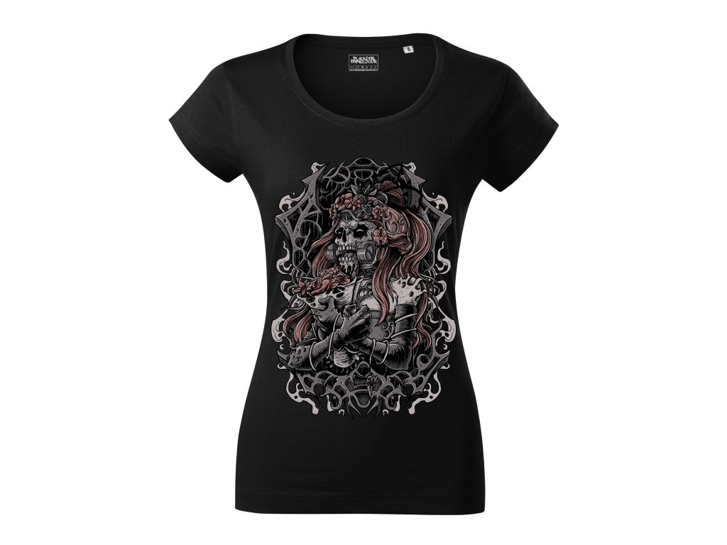 Dámské tričko s profesionálním potiskem značky Black dog brings death. Kvalitní značkové tričko ze 100% bavlny, které je řešeno do nejmenších detailů. Pyšní se svým výrazným motivem křižované nevěsty, která zaujme nejen vaše okolí. Textilie je stálá, nedeformuje se ani po desítkách praní. Kvalitní barevný potisk zaručuje dlouhou životnost a stálost barev. Vnitřní část průkrčníku je začištěna páskou z vrchového materiálu, ramenní švy jsou zpevněny páskou.
