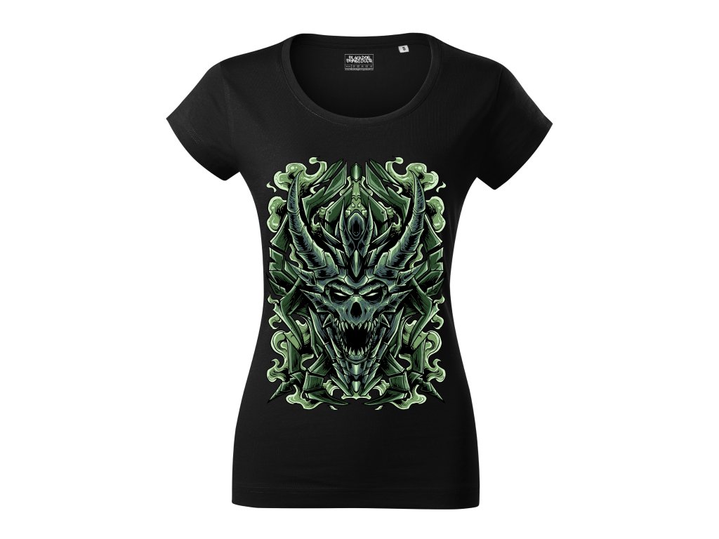 Dámské tričko s profesionálním potiskem značky Black dog brings death. Kvalitní tričko je vyrobeno ze 100% bavlny s motivem drakovy hlavy zelené barvy. Textilie je stálá, nedeformuje se ani po desítkách praní. Kvalitní barevný potisk zaručuje dlouhou životnost a stálost barev. Vnitřní část průkrčníku je začištěna páskou z vrchového materiálu, ramenní švy jsou zpevněny páskou.