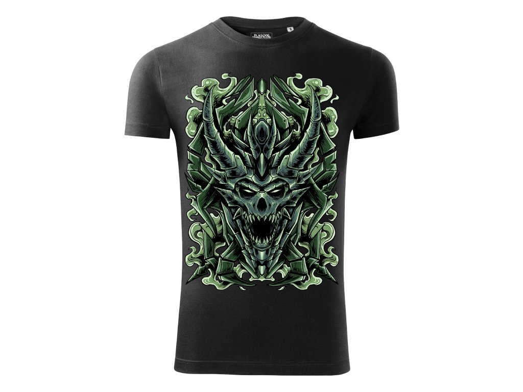 Pánské tričko s profesionálním potiskem značky Black dog brings death. Kvalitní tričko je vyrobeno ze 100% bavlny s motivem drakovy hlavy zelené barvy. Textilie je stálá, nedeformuje se ani po desítkách praní. Kvalitní barevný potisk zaručuje dlouhou životnost a stálost barev. Vnitřní část průkrčníku je začištěna páskou z vrchového materiálu, ramenní švy jsou zpevněny páskou.